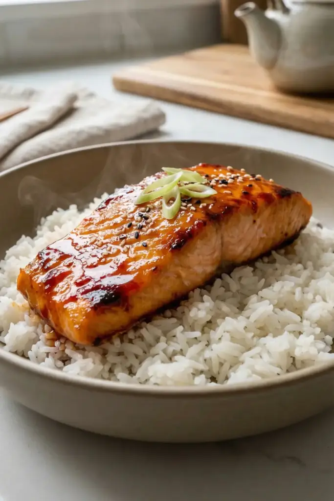 2. Spicy Sriracha Honey Salmon Over Jasmine Rice