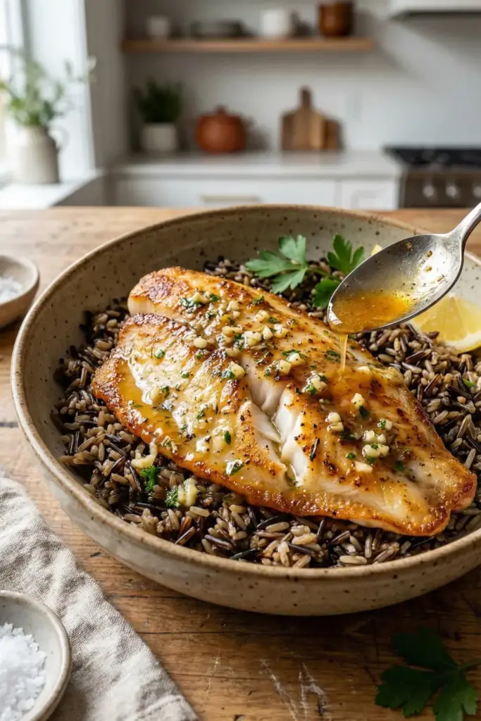 You sear the fish in a screaming hot skillet with minced garlic and a tiny dab of rich grass-fed butter.