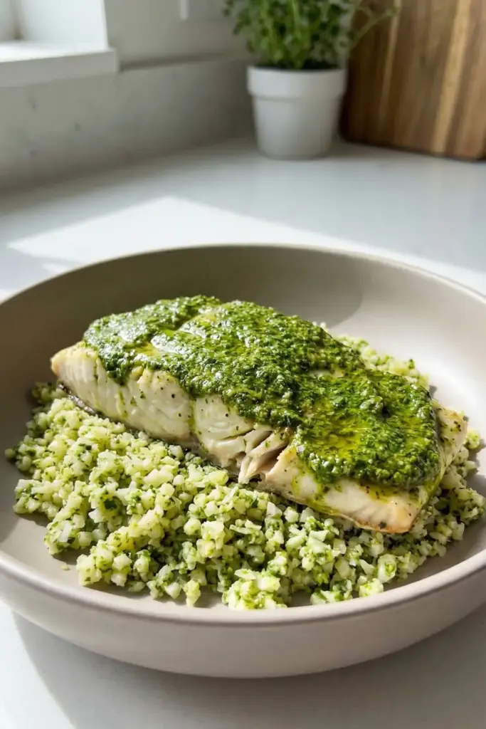 8. Pesto Baked Sea Bass Over Cauliflower Rice