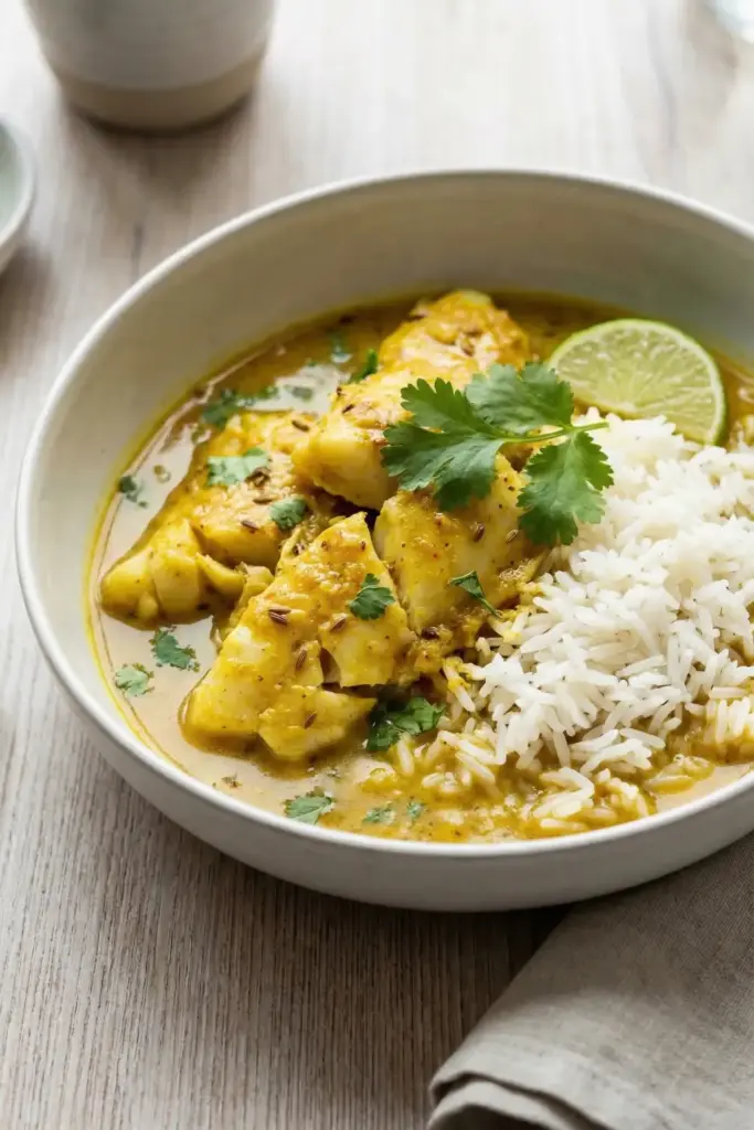 I simmer aromatic yellow curry paste with thick coconut milk and gently cook the delicate haddock right in the bubbling liquid.