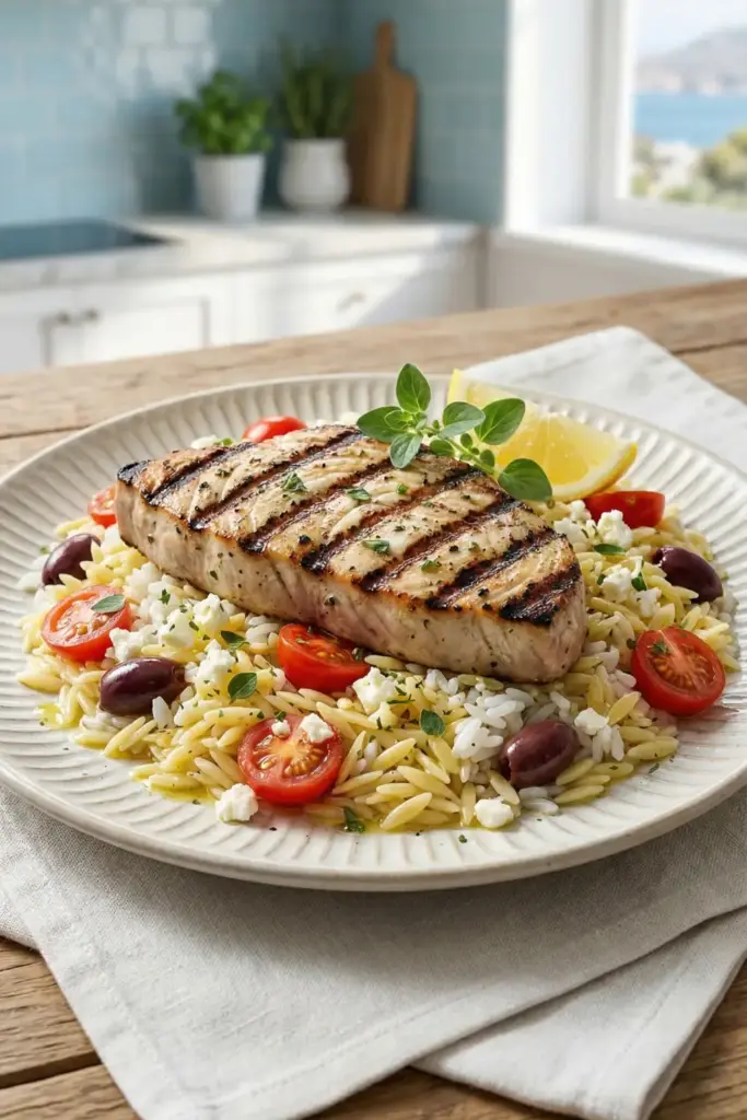 10. Mediterranean Swordfish Over Lemon Orzo and Rice