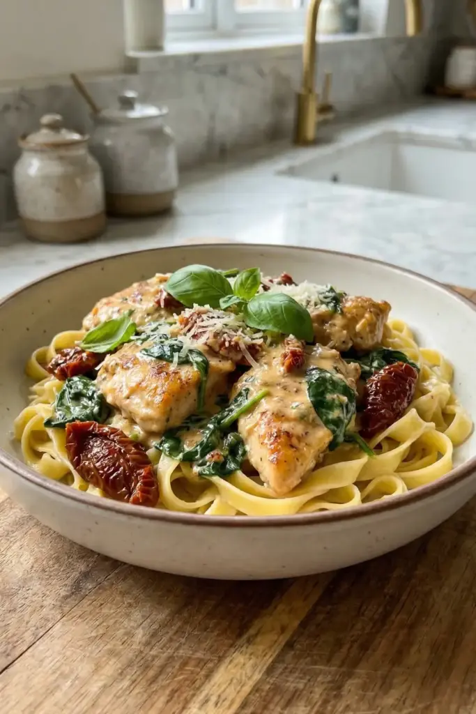 Sun-dried tomatoes and fresh spinach swim in a rich, creamy sauce.