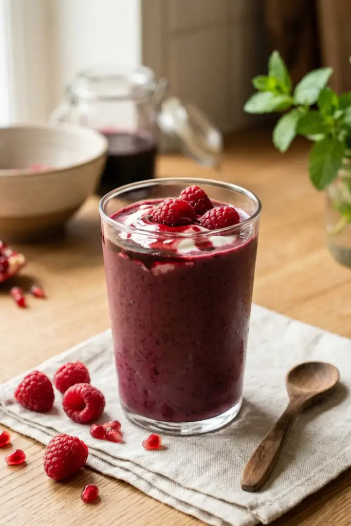 • Ingredients: 1/2 cup raspberries, 1 tbsp elderberry syrup, 1/2 cup pomegranate juice, 1/2 cup yogurt.