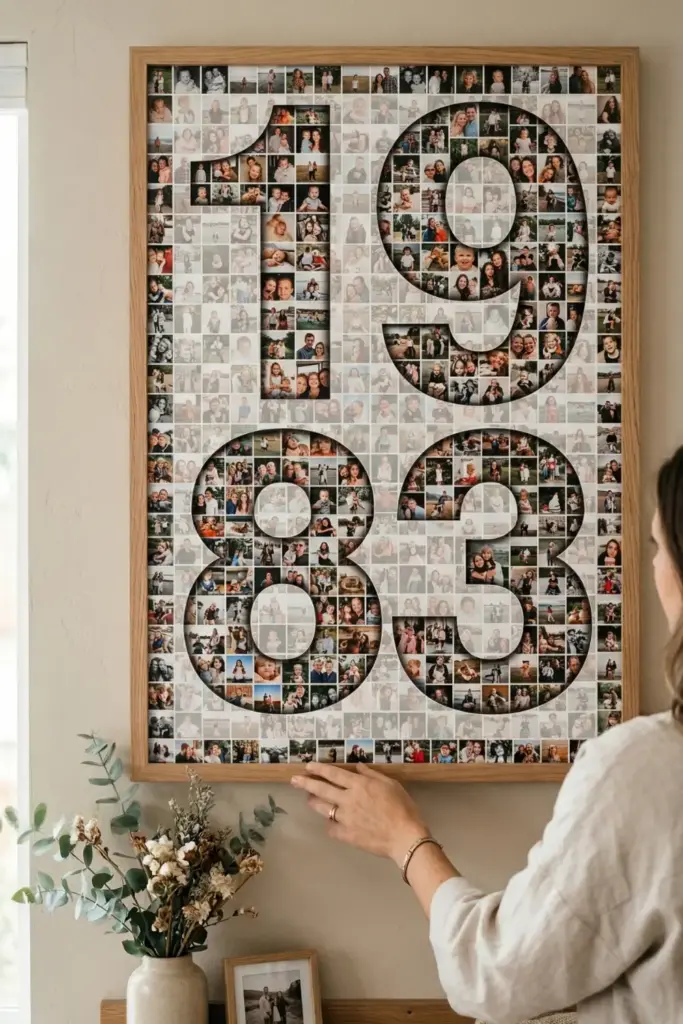 A large number (the year she was born or became a mom) made up of hundreds of tiny photos from throughout her life.